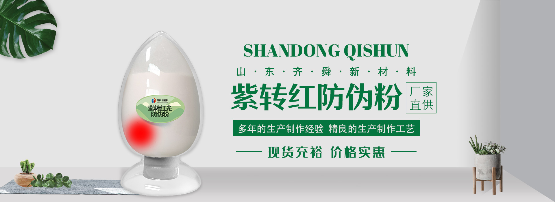 我公司前身為2011年成立的淄博舜明熒光科技有限公司。隨著公司的發(fā)展,廠(chǎng)址從淄博搬遷到青島,2020年5月公司重新注冊(cè)為山東齊舜新材料有限公司。公司注冊(cè)資本2000萬(wàn)元,主要從事新材料研究和開(kāi)發(fā)。目前主要產(chǎn)品包括:農(nóng)膜用轉(zhuǎn)光粉、轉(zhuǎn)光母粒以及轉(zhuǎn)光農(nóng)膜;農(nóng)膜用長(zhǎng)效防霧流滴涂覆液;復(fù)合肥添加劑及葉面肥(稀土微肥);防偽粉;LED封裝熒光粉;夜光粉;太陽(yáng)能光伏電池增效熒光粉;鋰電池正極材料等。